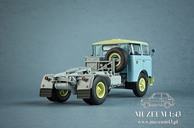 Na pierwszy rzut oka model prezentuje się świetnie. Od razu zwróciłem uwagę na wspaniałe koła, w których starannie odwzorowano charakterystyczne felgi. Szczególnie widoczne w ciągniku siodłowym podwozie, również zachwyca ilością detali. Kabina odwzorowana i pomalowana została prawidłowo, choć montaż bocznych okienek mógłby być nieco staranniejszy. Przy całokształcie, jest to jednak naprawdę nieznaczący drobiazg. Dzięki jasnej kolorystyce wnętrza kabiny, możemy z powodzeniem podziwiać różnokolorowe, oddające rzeczywistość detale.