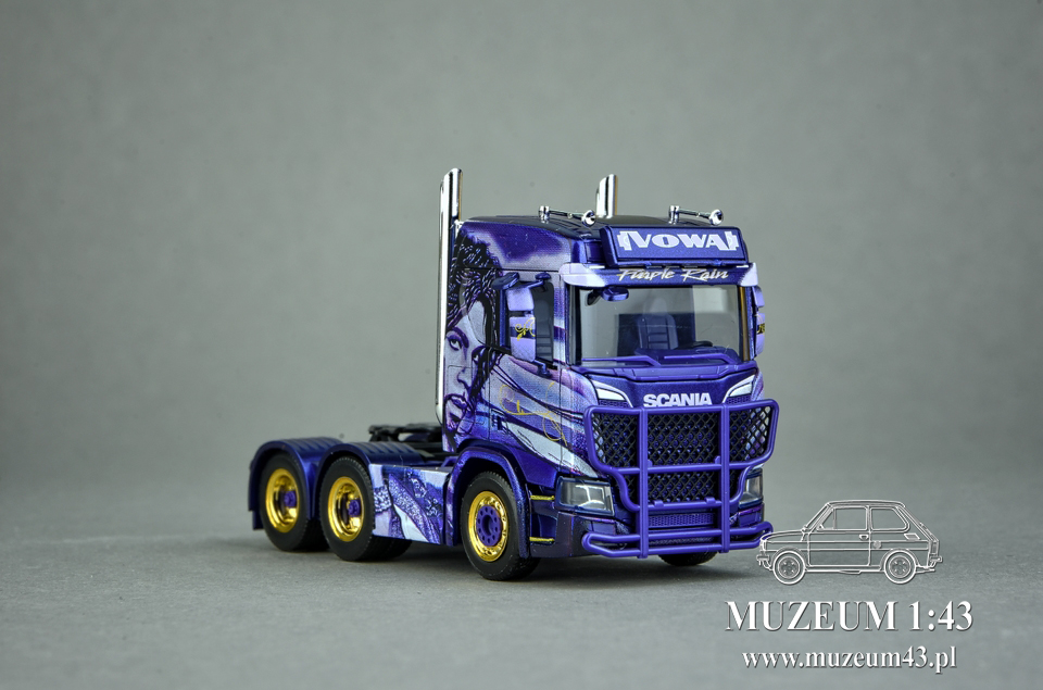 Długo zastanawiałem się, od czego zacząć ten wpis. Czy dobrym początkiem byłby napisanie, jak wielce fascynuje mnie prezentowana miniaturka? Czy może powinienem nakreślić sylwetkę człowieka, który stoi za tak nietuzinkowym projektem, jakim jest oryginał Scanii R650 w malowaniu Purple Rain? Czy wreszcie, może najlepiej byłoby na początek napisać kilka słów o muzycznej legendzie, która była inspiracją dla powstania tego szesnastokołowca? Trudny orzech do zgryzienia. Postanowiłem zacząć od samego oryginału, czyli skąd wziął się pomysł na szesnastokołowy hołd dla twórczości legendarnego amerykańskiego muzyka i producenta – Prince’a.